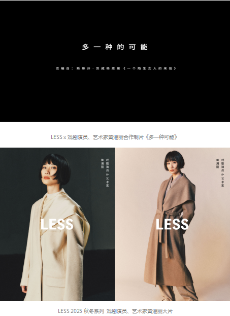 物质丰盈的当下,当代女性正将目光转向内在世界的构建,渴望在繁杂日常中找到真正属于自己的精神空间。作为中国高端设计师女装品牌,LESS不仅仅着眼于服装本身,更希望通过内容与表达,为女性打开更多精神文化路径,建立多维而深刻的情感连接。对LESS而言,品牌的责任不仅是为女性创造富有美感的服饰,更在于提供精神层面的陪伴与生活范式的启发,赋予女性从容自信的力量。 与女性同行,开启LESS「阅读宇宙」 始于LESS对当代女性处境的深刻洞察,怀抱「赋予女性消费者从容自信的力量」这一核心愿景,品牌开启了一场从外在衣着到内在滋养的探索。 缘起于2023年冬季诞生的「0压系列」,强调面料的「亲肤、柔软、舒适」,以衣为媒,帮助女性抵御外在压力;借此,LESS持续思考女性内在减压的途径,建立了属于品牌的「0压阅读宇宙」——与8位国内外女作家合作,在全国范围内举办27场读书会,与女性消费者共同探讨书籍内容、关注自我成长与感受。借由书籍,引导女性向内探寻,生长出对抗平凡日常的勇气。至此,LESS以「阅读」的形式为所有女性创造专属精神疗愈时刻,而它也成为LESS文化领域的基底。 ![]() ![]() 时尚与戏剧跨界联合,全新叙事视角解锁女性「多一种的可能」 2025年秋冬,LESS将文化触点从「阅读」延伸至「戏剧」,完成了从文本到舞台、从二维到三维的跨越。此次,LESS携手戏剧演员、艺术家黄湘丽打造品牌制片,以「多一种的可能」为主题灵感,共同为经典独角戏《一个陌生女人的来信》书写全新结局,传递出精神主张——生活与穿衣,女性随时都可以开始「多一种的可能」。 ![]() ![]() 在戏剧呈现中,黄湘丽上身LESS 2025秋冬系列大衣单品。舞台上,大衣不仅是外在造型,更成为叙事的一部分,通过服装的切换演绎,展现出女性在不同场景中从容穿梭的可能性。 ![]() 粗纺双面呢H型长款大衣以流畅的H型轮廓塑造修长身形,精选质感柔软的粗纺双面呢料,完美平衡保暖性与轻盈感。可拆卸全真丝围巾成为点睛之笔,丝质流光与羊绒质感形成精妙对撞,可随心系出不同造型,为女性提供更多自由搭配的可能性。 ![]() 粗纺双面呢T型中长款大衣以超宽松衣身解构传统廓形,不对称领口设计与双面异色呢料相映成趣,呈现随性而富有层次感的造型。这种不拘一格的设计语言,让女性在松弛穿搭中自然流露优雅气质,正是更多可能性的生动诠释。 以文化为核,构建女性的「第三空间」 LESS始终相信,在物质与社交之外,女性需要一个能自由探索自我、安放精神的场域;并通过阅读、戏剧等文化内容的创造与联结将此场域不断完善构建,使文化养分浸入女性日常。同时,LESS致力于成为联结独立个体与思想的媒介,引领女性探索内心世界的觉醒与丰沛,为女性开拓一切可能的路径。未来,LESS也将会以持续的文化实践,成为当代女性自我探索和成长的「文化伴侣」,重新定义女性服饰品牌的社会角色。 LESS 2025秋冬系列已在LESS线上官方商城及线下店铺开售,这个冬天,从一件大衣开始,由一场文化体验延续,共同探索生活「多一种的可能」。 【关于LESS】 2003年,江南布衣公司创立了女装品牌LESS,其极简主义基因来自知名建筑师密斯.凡.德罗“LESS IS MORE”的建筑设计哲学,对于LESS而言,LESS IS MORE的意义在于“生活是减法,成长是加法”,我们相信更简约的方式可以成就更多的惊喜。品牌设计观以“简约、精工、独立、精致”为宗旨,服务于30-45 岁独立、理性且专注热衷于简约生活的新一代高知女性。用精致耐久的系列轻松应对各式各样的场合,是我们美好的愿望;给生活和设计做减法,带来高效而丰富的成长是我们始终如一的信条。 了解更多资讯,请关注品牌官网:https://www.less.cn/ ![]() |