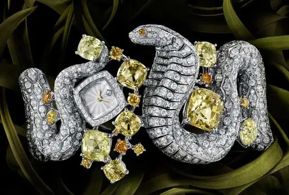 作为百年珠宝世家,宝诗龙的蛇形腕表更像是可佩戴的艺术品。1878 年,品牌创始人 Frédéric Boucheron 以蛇为灵感创作的珠宝作品,开启了对这一元素的百年探索。宝诗龙的蛇形表打破了 “写实” 框架,以抽象手法重塑蛇的形态:蛇身可能是扭曲的铂金藤蔓,蛇鳞化作镂空的蕾丝花纹,甚至将蛇头解构为水滴形宝石(如蓝宝石、翡翠),通过精湛的 “隐镶工艺” 让宝石与金属无缝衔接,仿佛蛇身天生裹挟着星光。其最新推出的 Serpent Bohème 系列,以不对称设计与渐变宝石色调,让蛇形在光影中呈现流动的韵律,重新定义了珠宝腕表的艺术边界。